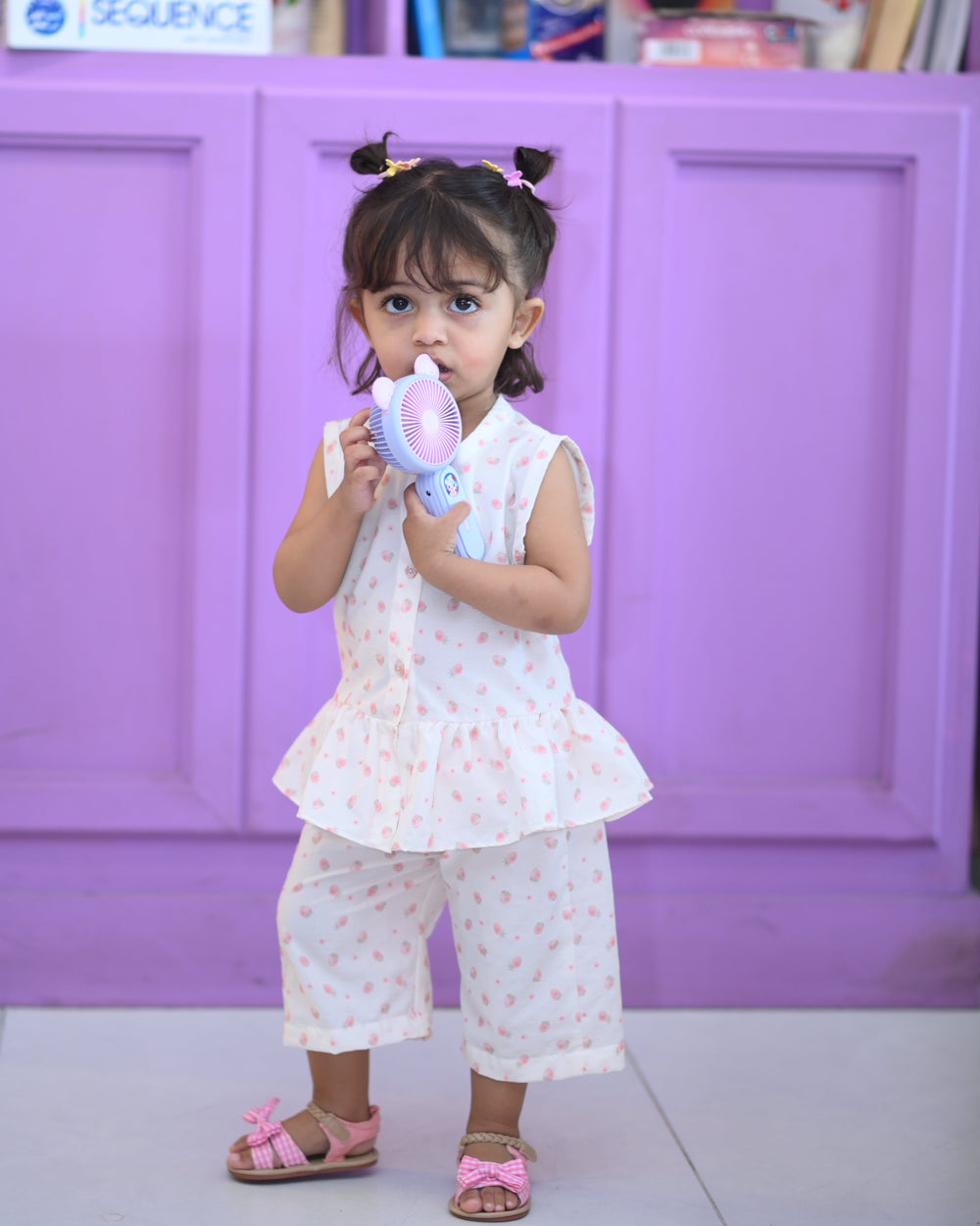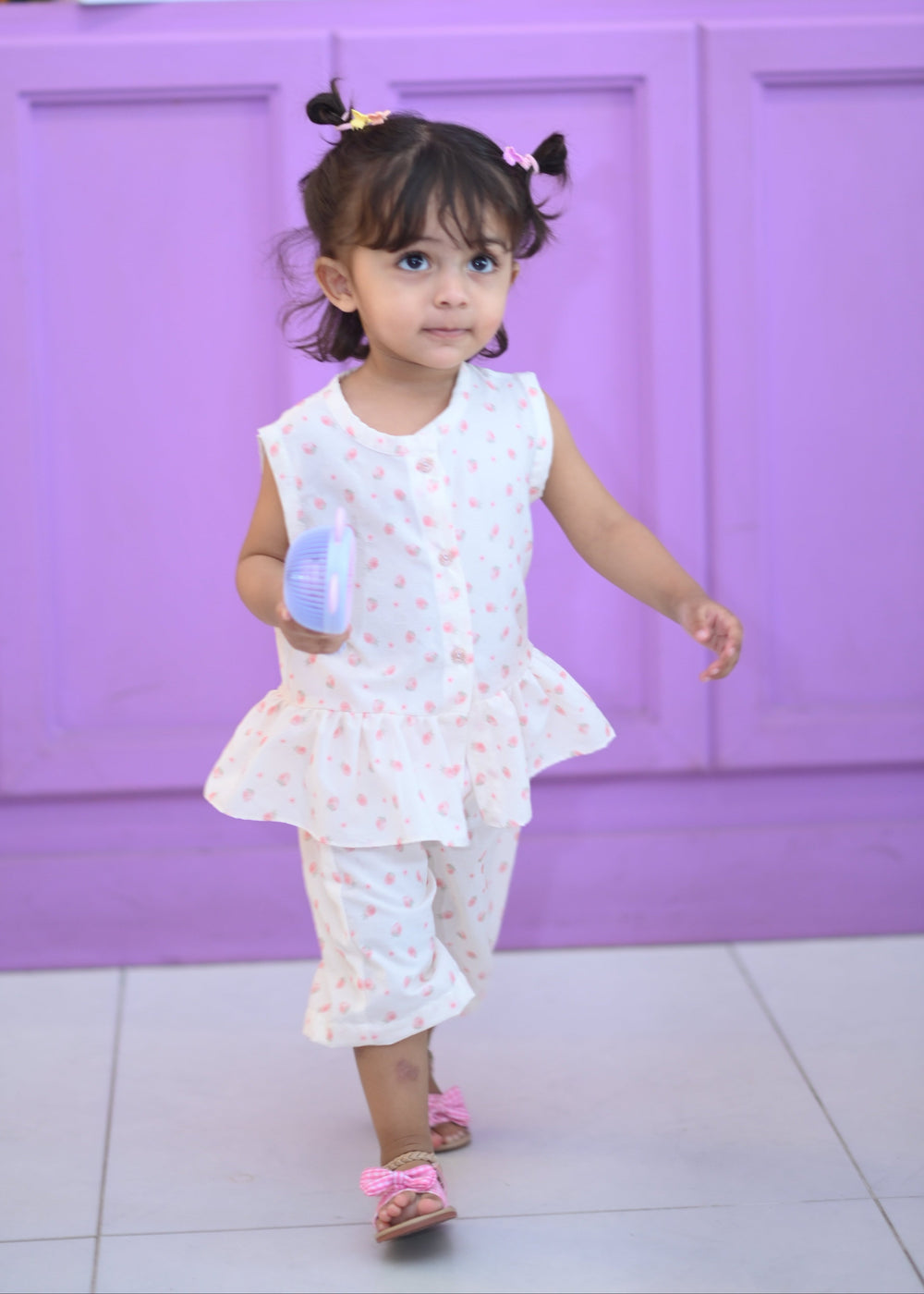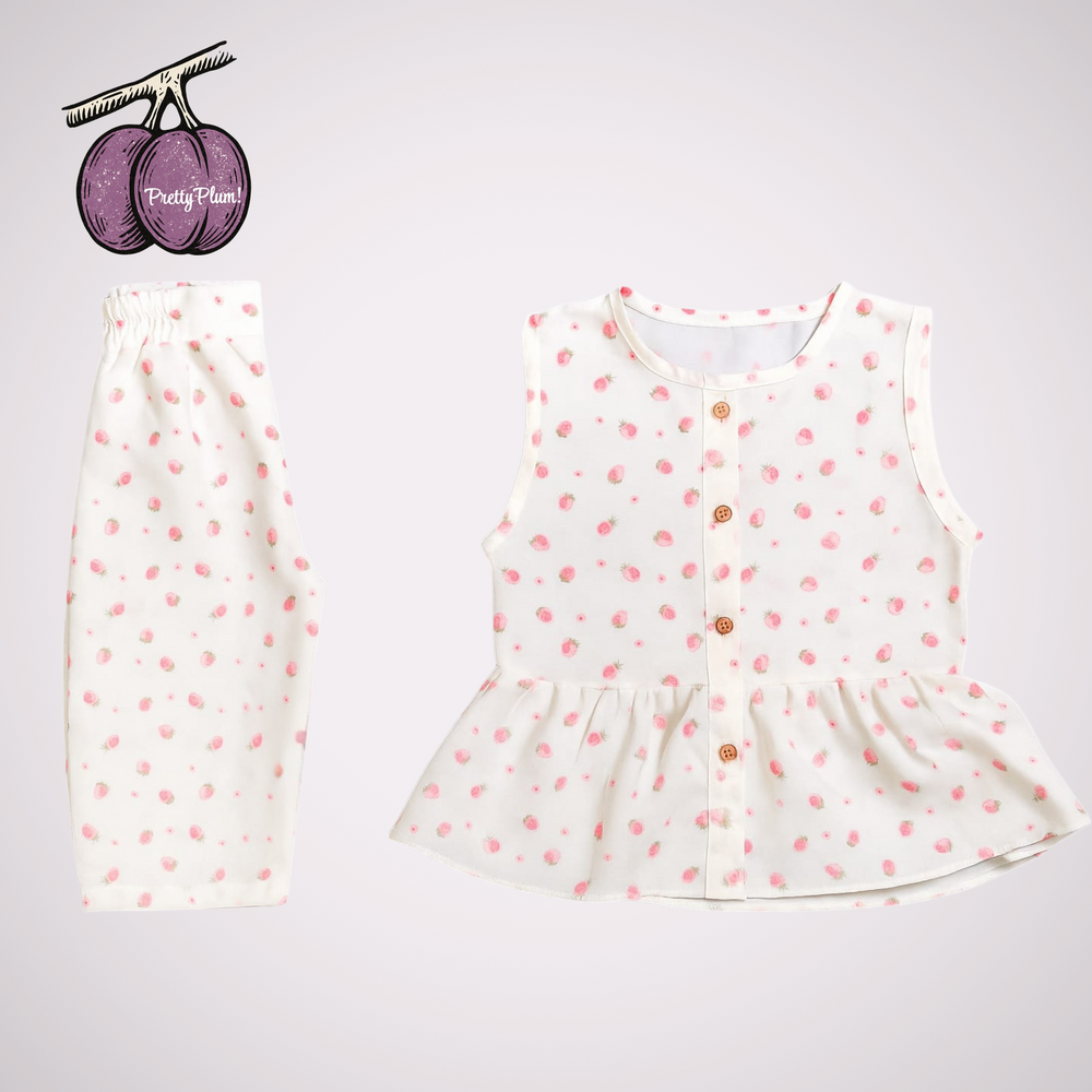 Designed with playful elegance, this sleeveless co-ord set bloomed with strawberries brings comfort and style together for your little fashionista. The flared silhouette adds a breezy charm, while the soft white and pink shades give it a fresh, graceful look—perfect for festive occasions, parties, or everyday chic wear.