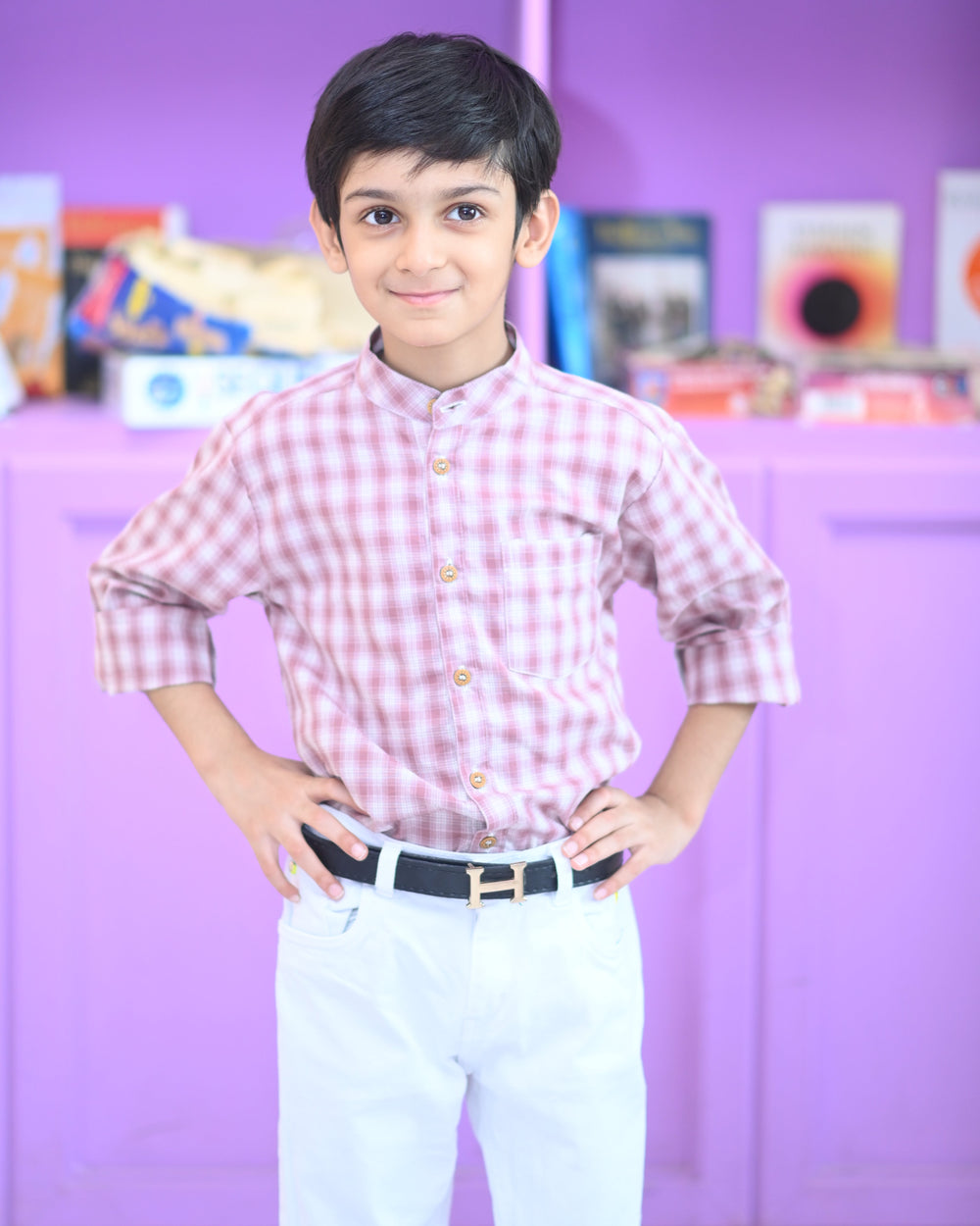 Designed with a refined checkered pattern, this shirt adds a smart yet playful charm to your little one’s wardrobe. The sleek ban collar enhances its classic appeal, while the soft fabric ensures all-day comfort. In a rich dusky plum shade, it’s the perfect blend of tradition and modern elegance—ideal for festive occasions, family gatherings, or stylish everyday wear.